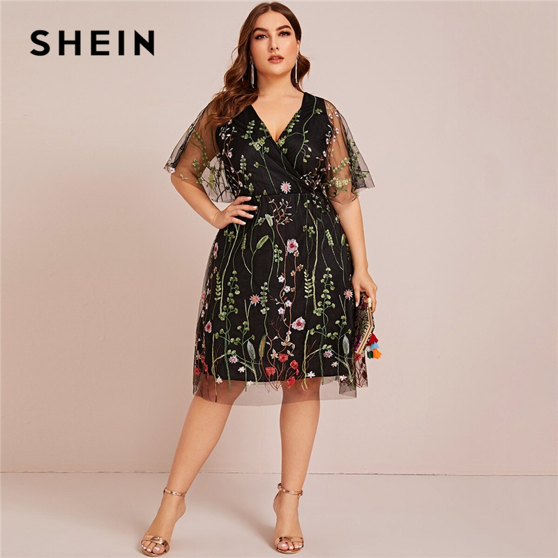 Shein Plus Size Floral Embroidered Mesh A Line Black Dress Women Summer Half Sleeve V Neck Empire Elegant Midi Flared Dresses Price History Review Aliexpress Seller Shein Official Store